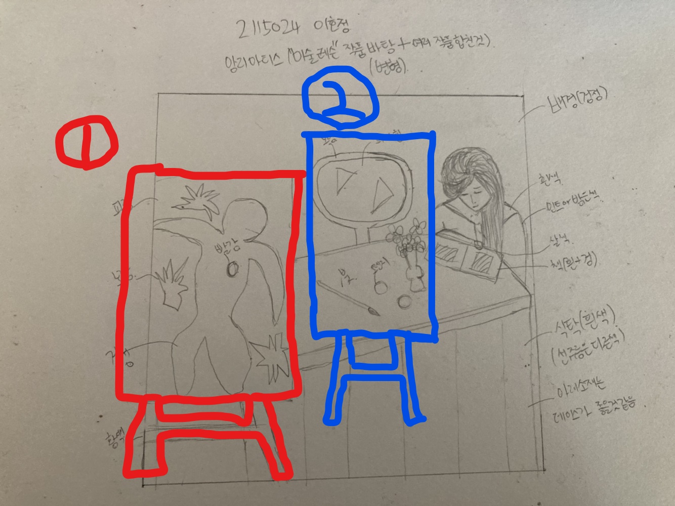 이젤에 들어가는 이미지가 너무 재밌는 아이디어인데..아트웤을 간결하게 만든다는 의미에서 두가지 솔루션을 제시할테니 그 중 하나로 작업되면 좋을거 같습니다. 두번째(파란색)일경우는 거울과 화병 식탁주름, 오렌지 하나 정도로만 화면 구성하면 좋을거 같습니다.